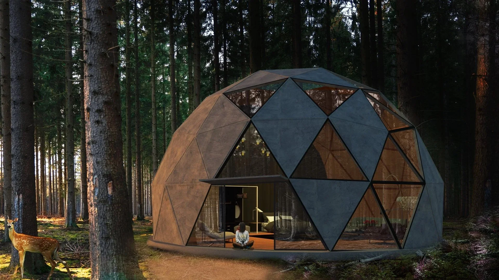 The A-Tent design is elevated on a stilt structure, built from standardised modular components. Similarly, the Suspended form hangs from above, utilising the same modular framework while allowing for unique customisation of individual components. Ideal for flat terrains, the Doughnut cabin is defined by its curved form, where each module can be expanded through the addition of a deck or pergola. The triangular Tri-terra modules are designed for organic growth and can be easily extended through clustering. These diverse designs are unified by high-quality, durable materials, including aluminium frames, Corten steel exterior cladding, and insulated panels, which introduce a resilient and modern element to the overall aesthetic.